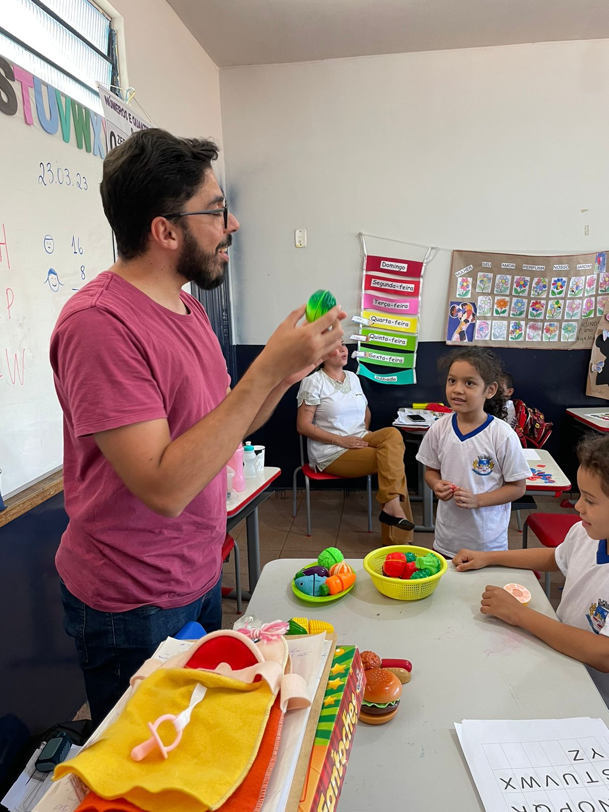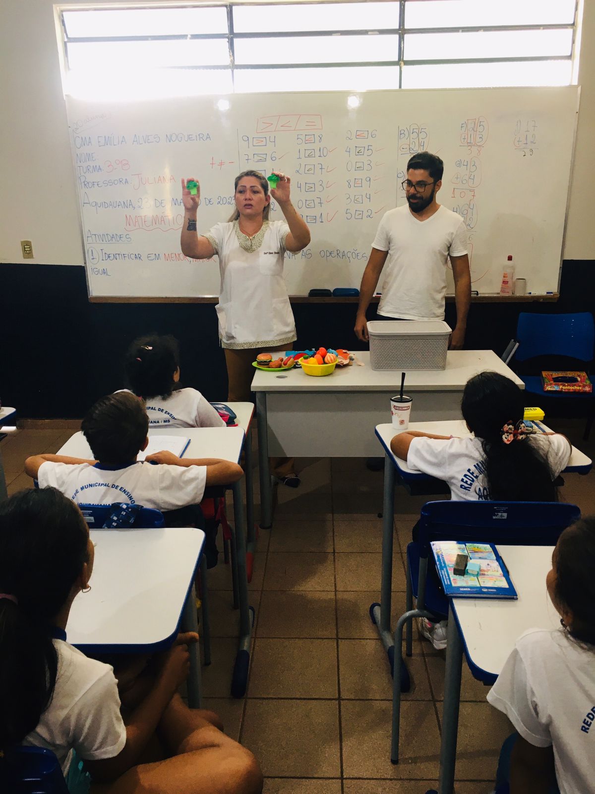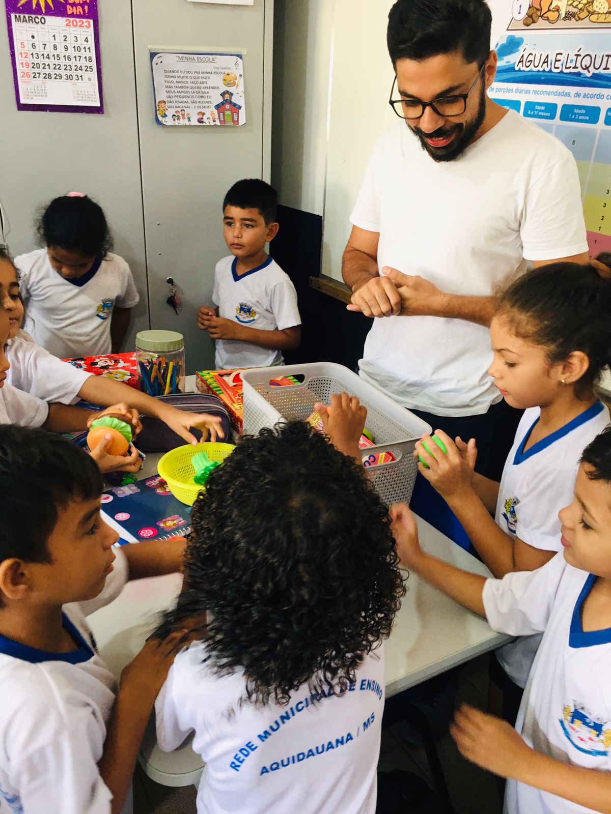 Os profissionais da ESF Nova Aquidauana, enfermeira, nutricionista, educador físico e agentes comunitários de saúde estiveram em todas as turmas trabalhando a temática da “Alimentação Saudável”. As crianças adoraram, especialmente, porque teve teatro de fantoches e dinâmicas englobando atividades físicas.