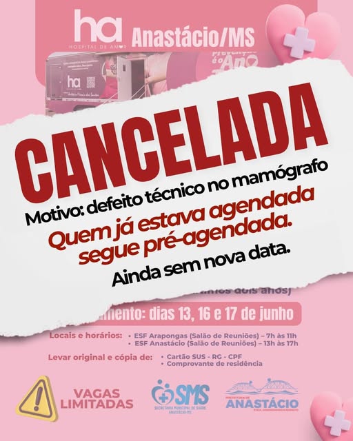 A unidade móvel do Hospital de Amor, que realizaria exames de mamografia em Anastácio, teve sua visita CANCELADA devido a defeito técnico no mamógrafo.
