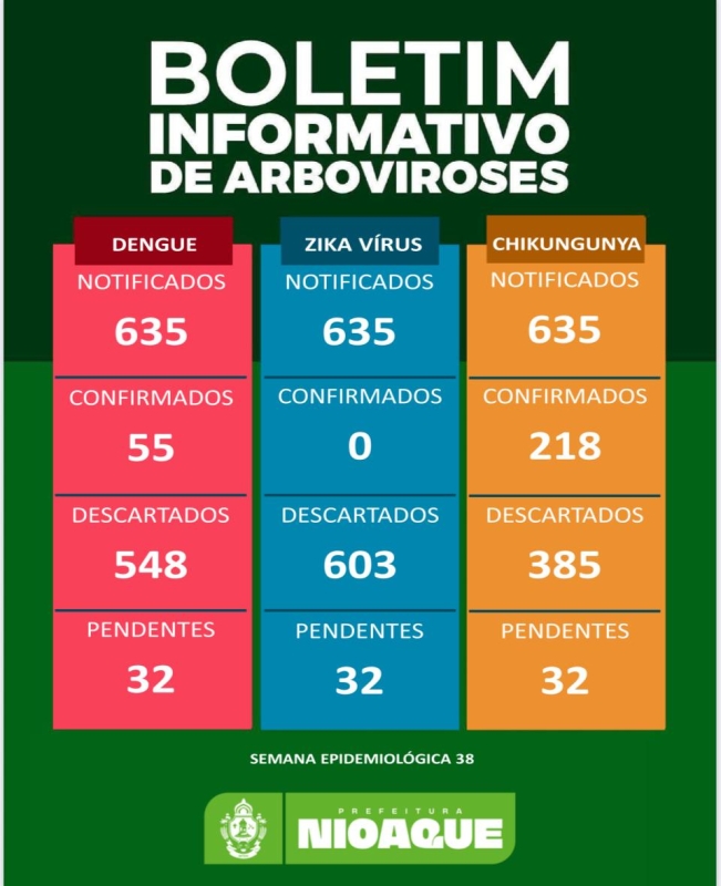 A Secretaria Municipal de Saúde de Nioaque, por meio da Vigilância Epidemiológica, divulgou o boletim da 38ª Semana Epidemiológica de 2025 com dados atualizados sobre as arboviroses registradas no município. O documento apresenta informações sobre casos notificados, confirmados, descartados e pendentes das doenças causadas pelo mosquito Aedes aegypti: Dengue, Zika Vírus e Chikungunya.