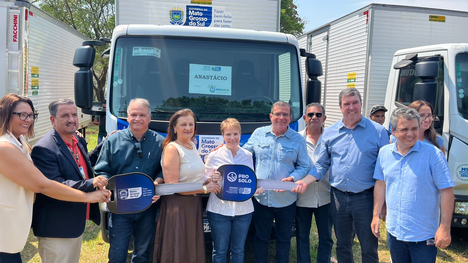 Anastácio foi contemplado com um caminhão baú, e o Prefeito Cido, acompanhado da Vice-Prefeita Maria Vital, recebeu as chaves das mãos do Governador Eduardo Riedel e da Senadora Tereza Cristina.