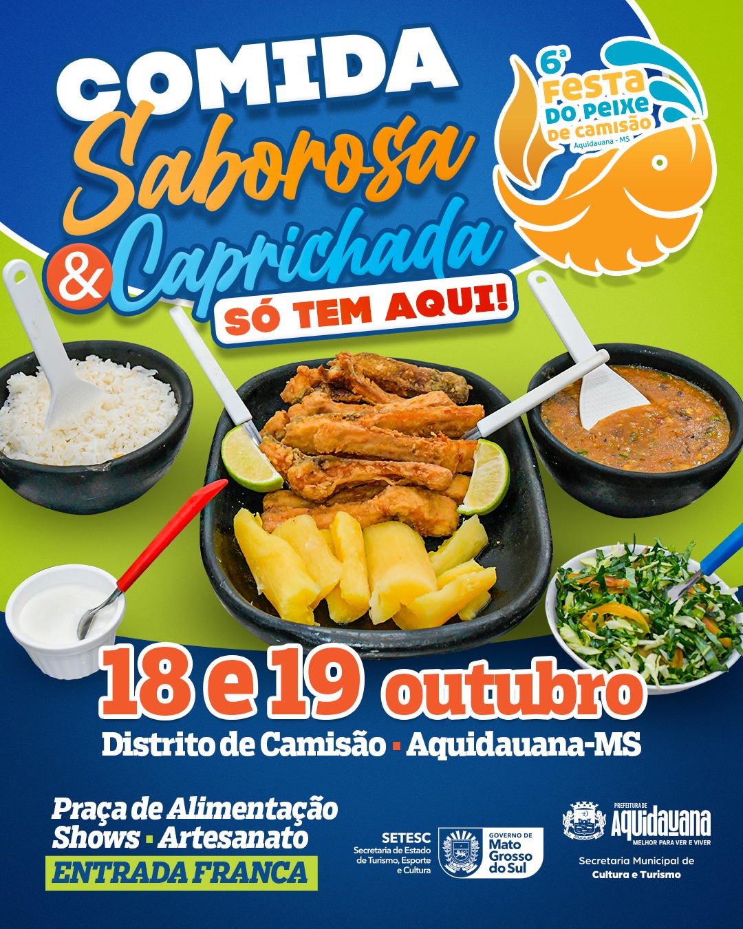 18 e 19 de outubro, Distrito de Camisão – Aquidauana/MS. Teremos praça de alimentação, artesanato, shows incríveis e claro: muita comida saborosa e caprichada.