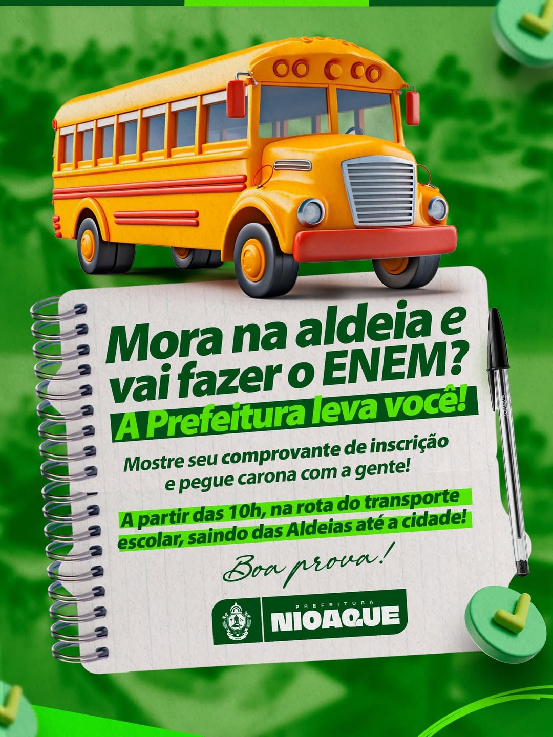 Neste domingo tem a primeira etapa do Enem, e a Prefeitura de Nioaque vai garantir o transporte das aldeias indígenas até a cidade!