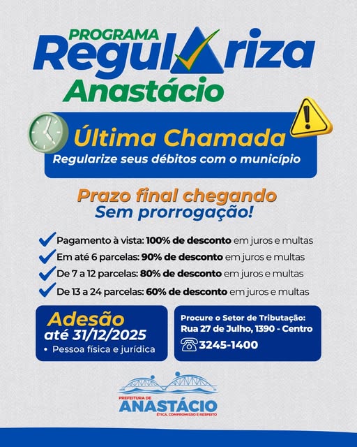 A Prefeitura de Anastácio está fazendo a última chamada para quem precisa regularizar seus débitos com o município. Esta é a oportunidade ideal para colocar tudo em dia com condições especiais e descontos que não se repetirão.