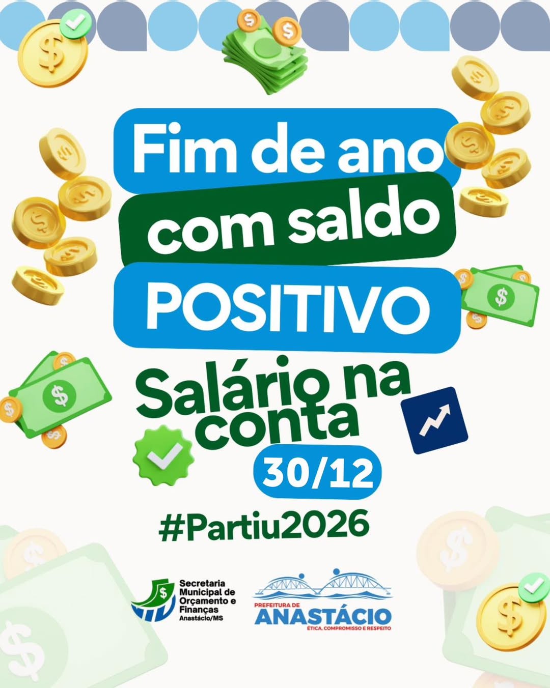 Uma boa notícia para encerrar o ano com chave de ouro: a Prefeitura de Anastácio realiza hoje o pagamento do salário referente ao mês de dezembro.